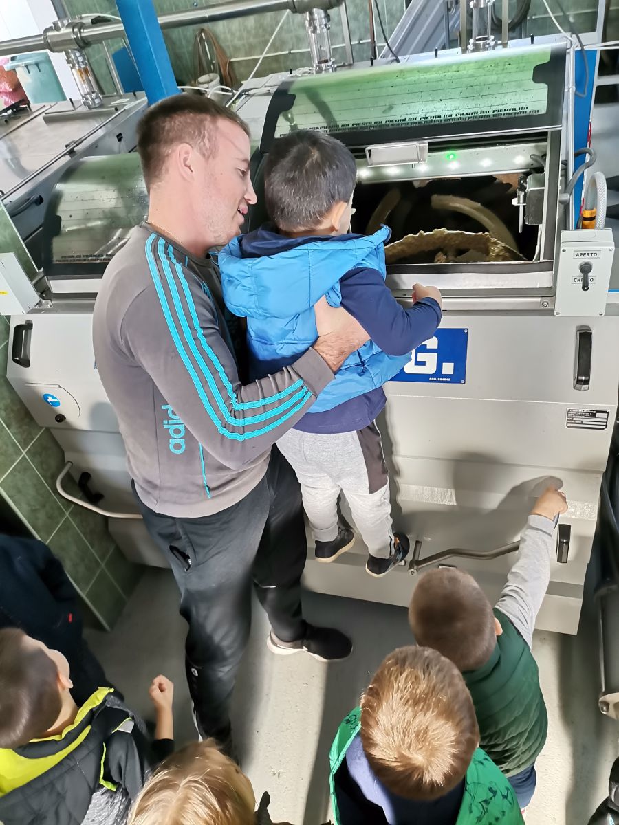 Martin je djeci pokazao koji je put od prerade ploda masline do dobivanja maslinovog ulja. Pritom su djeca samostalno ubacivala masline u koš. Nakon toga, masline se peru te potom melju. Obzirom da je stroj za mljevenje na povišenoj razini, Martin je rado podignuo jedno po jedno dijete kako bi svako od njih imalo priliku vidjeti gnječenje i prešanje maslina.